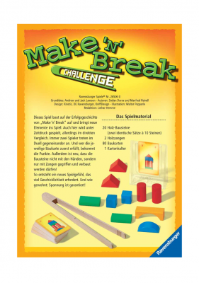 Make n Break ist die spannende Herausforderung für große und kleine Baumeister. In der kompakten Version von Make n Break bauen die Spieler unter Zeitdruck Aufgaben nach. Spielregel für drei und Vier Spieler Die Änderungen für zwei Spieler finden Sich auf Seite 6 Es spielen immer zwei Spieler im Duell gegeneinander. Der Spieler mit den meisten Punkten gewinnt. Mit 10 farbigen Bauklötzen gilt es so schnell wie möglich die vorgegebenen Bauwerke korrekt nachzubilden.